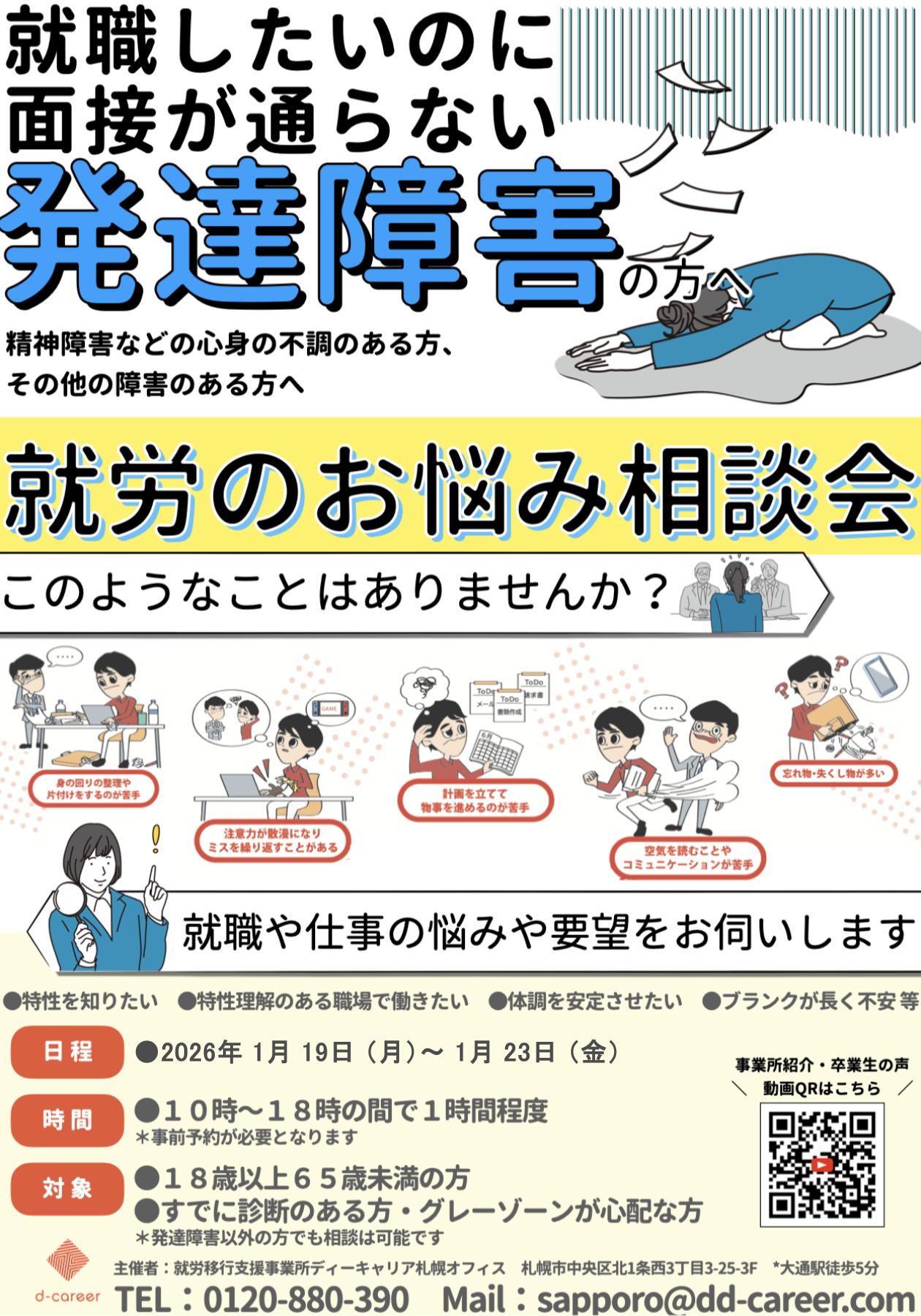 【ディーキャリア札幌オフィス】1月22日(月)・23日(火)・24日(水)・25日(木)・26日(金)「発達障害の方・障害のある方のための就労相談会」