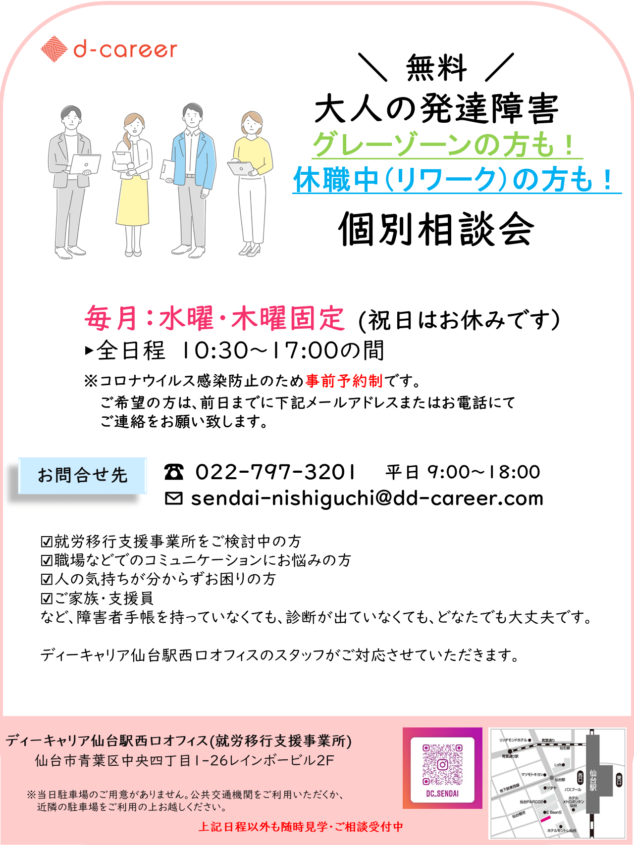 【ディーキャリア仙台駅西口オフィス】12月毎週水・木曜日開催「参加費無料!大人の発達障害 個別相談会」
