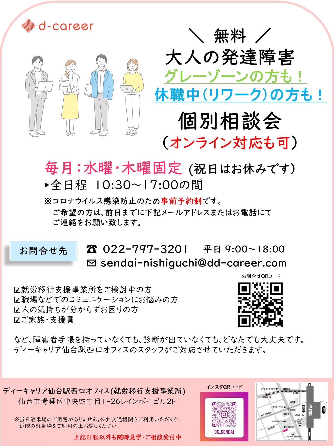 【ディーキャリア仙台駅西口オフィス】2024年4月毎週水・木曜日開催「参加費無料!大人の発達障害 個別相談会」【オンライン対応可】