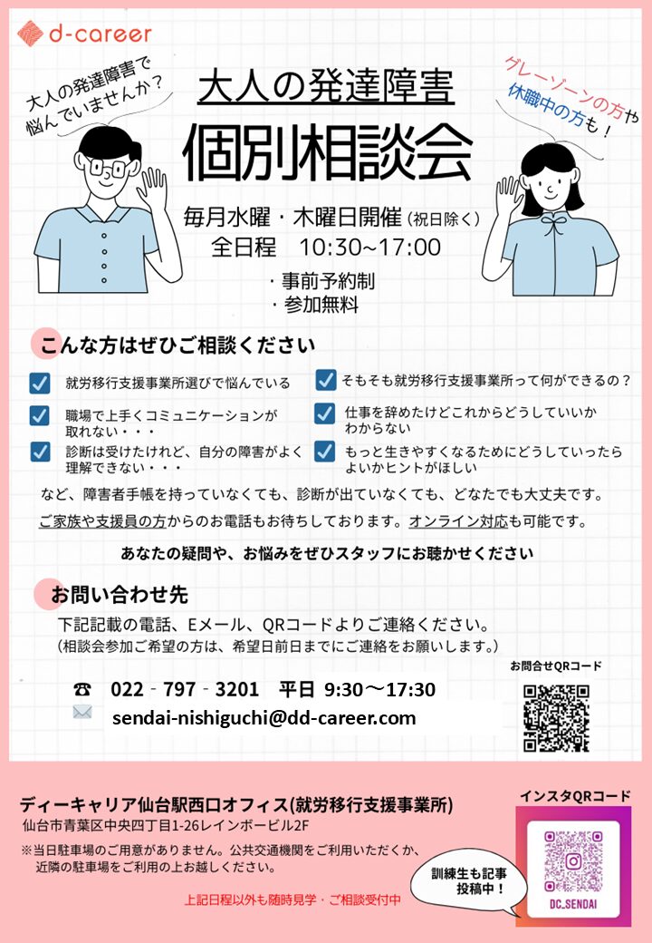 【ディーキャリア仙台駅西口オフィス】2025年11月毎週水・木曜日開催「参加費無料!大人の発達障害 個別相談会」【オンライン対応可】