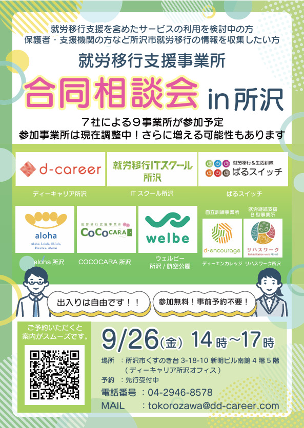 【ディーキャリア所沢オフィス】09月26日(金)「就労移行支援事業所 合同相談会in所沢」