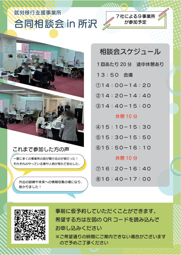 7社による9事業所が集まり、複数の就労移行支援事業所の内容を知ることができます。