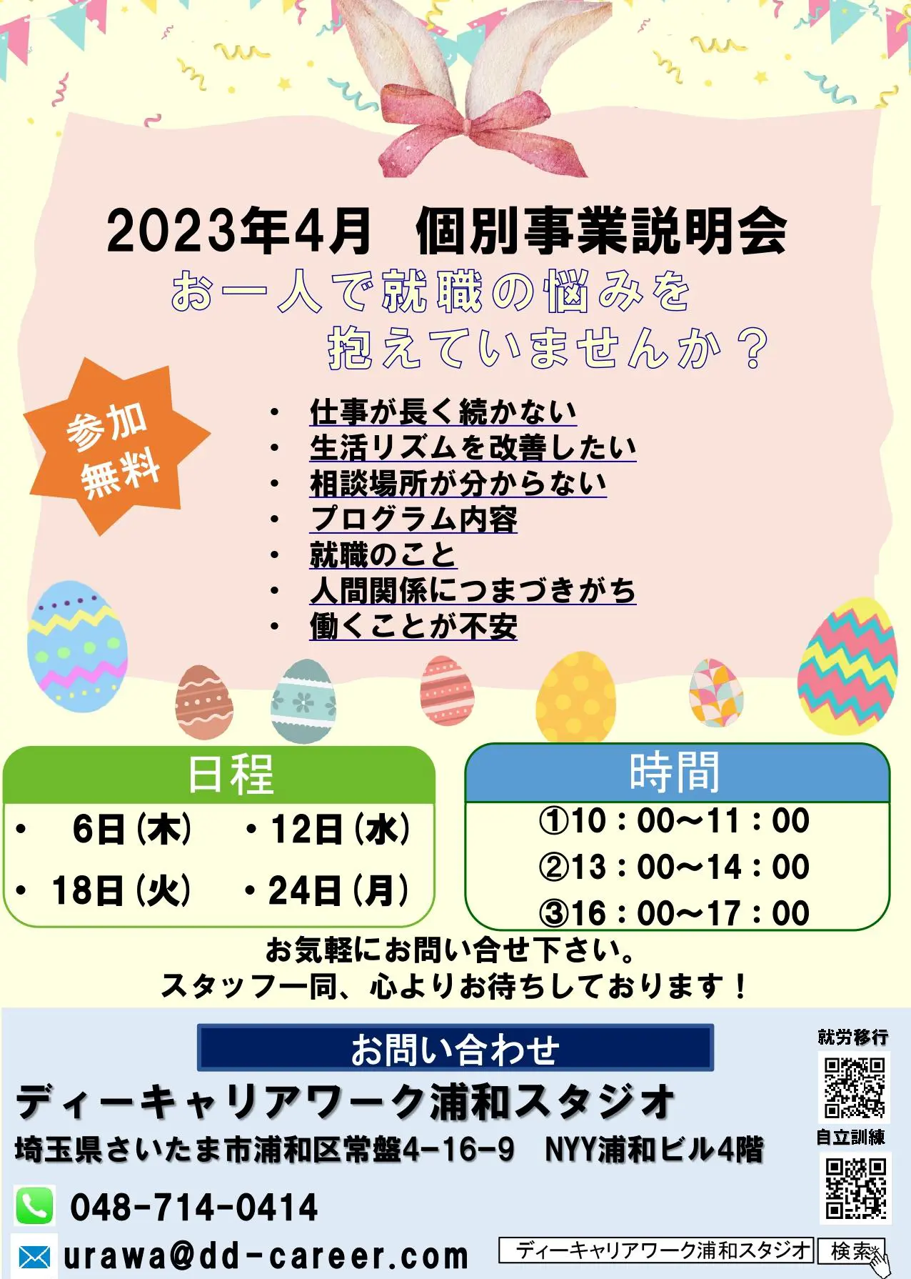 【ディーキャリアワーク浦和スタジオ】4月06日(木)・12日(水)・18日(火)・24日(月)開催「個別事業説明会」