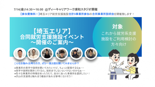 【ディーキャリアワーク浦和スタジオ】7月14日(金)開催「【利用検討者向け】埼玉エリア就労支援事業所合同説明イベント開催!」