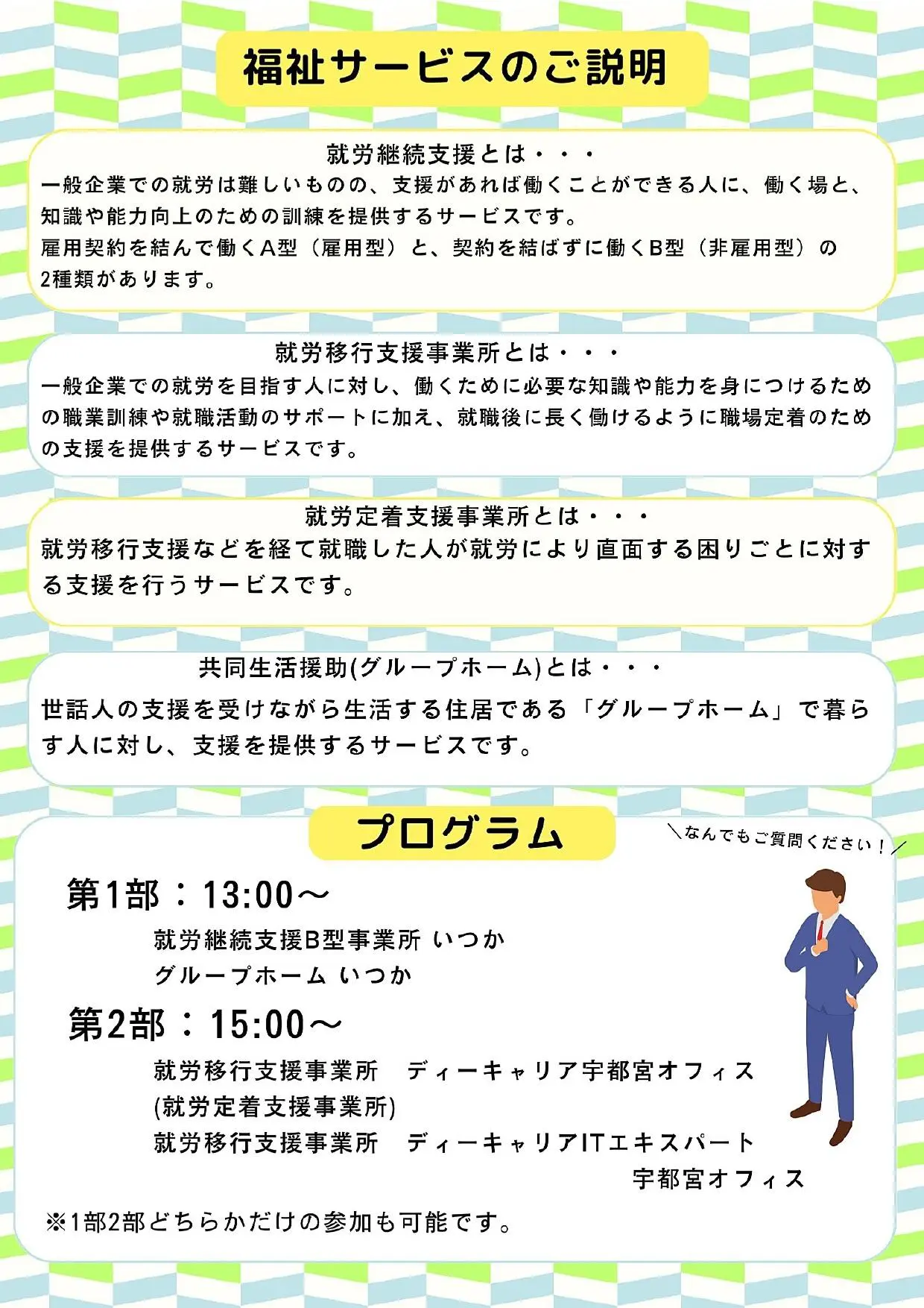福祉サービスに興味はあるけど良くわからない…という方、ぜひご参加下さいね。