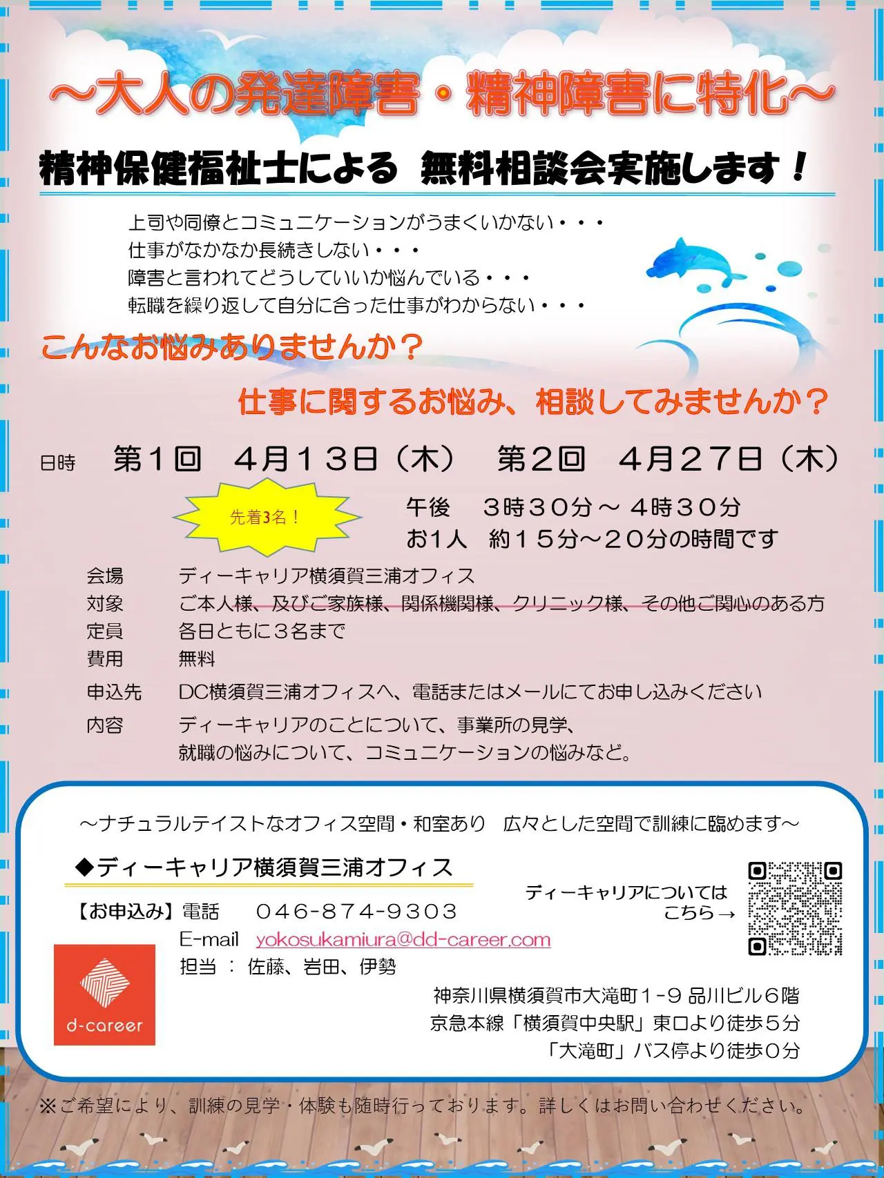 【ディーキャリア横須賀三浦オフィス】4月13日(木)・27日(木)「精神保健福祉士による なんでも相談会」