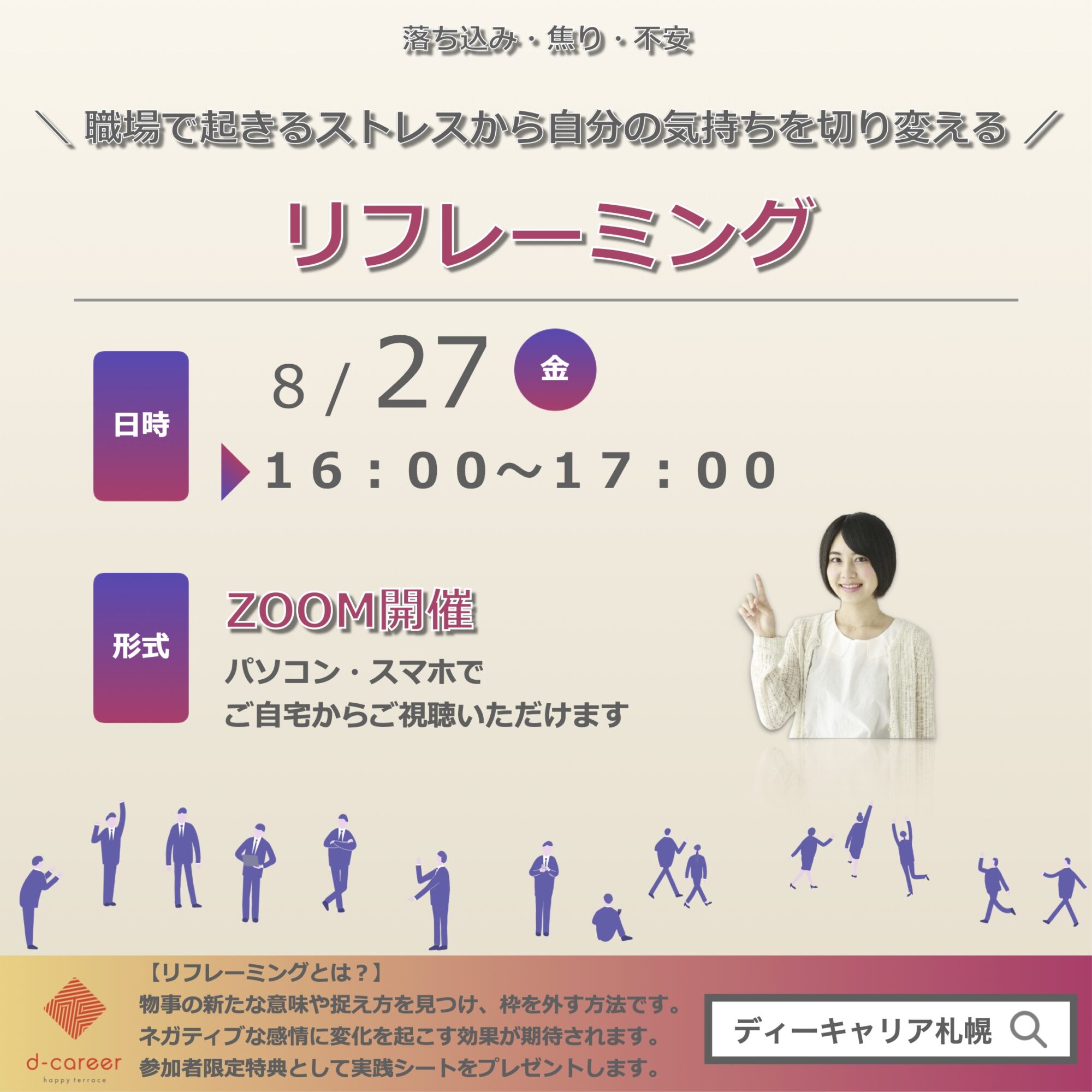 【ディーキャリア札幌オフィス】8月27日(金)「職場で起きるストレスから自分の気持ちを切り替える〜リフレーミング体験会〜」